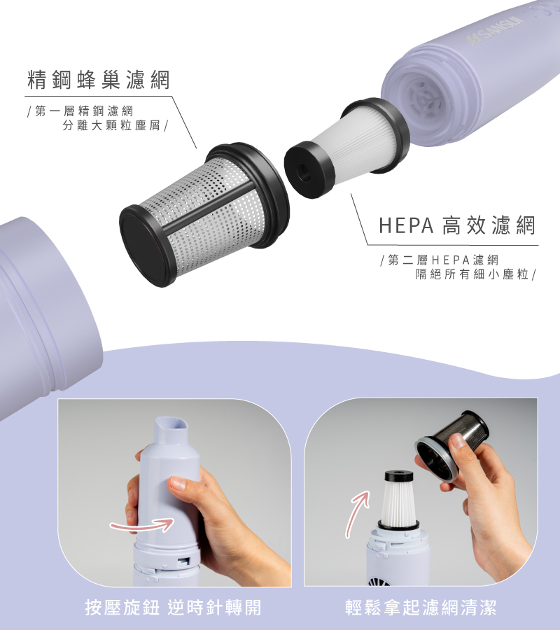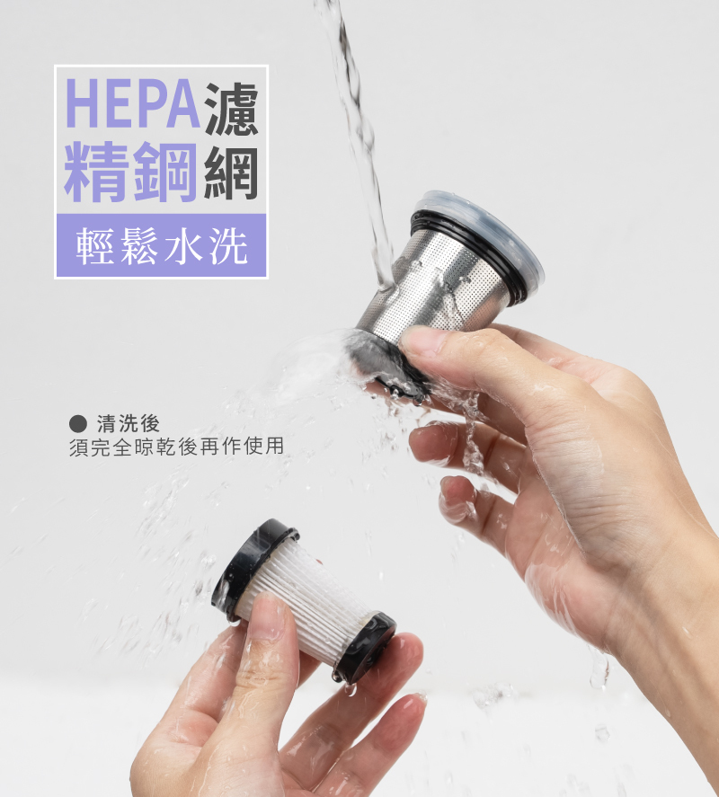 ●蜂巢式精鋼濾網+HEPA濾網可水洗清潔