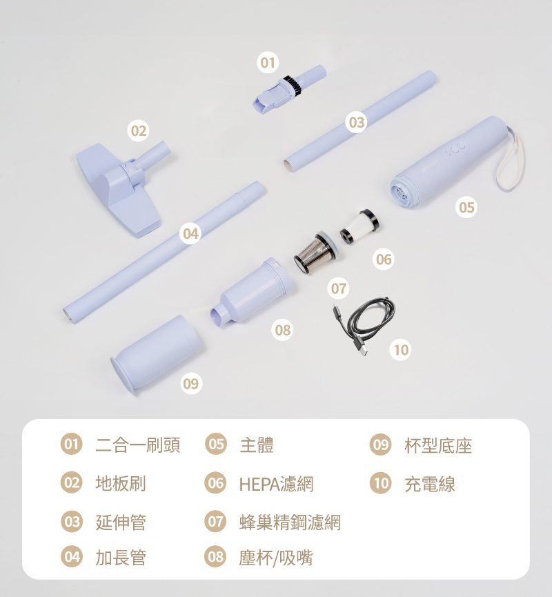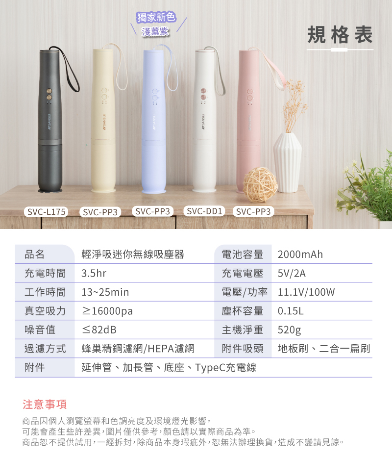 產品名稱:輕淨吸無線吸塵器 型號:SVC-DD1/SVC-L175/SVC-PP3/SVC-PP3Y 電池容量:2000mAh 充電電壓:使用5V/2A充電插頭 電壓/功率:額定電壓11.1V/100W 充電時間:3.5hr 工作時間:13~25min 真空吸力:≤16kpa 塵杯容量:0.15L 過濾方式:蜂巢式精鋼濾網/HEPA濾網 噪音值:≤82dB 主機淨重:600g 附件吸頭:地板刷、二合一扁刷 附件:延伸管、加長管、底座、TypeC充電線 產地:中國 保固:全機保固一年。 貨源:公司貨 |