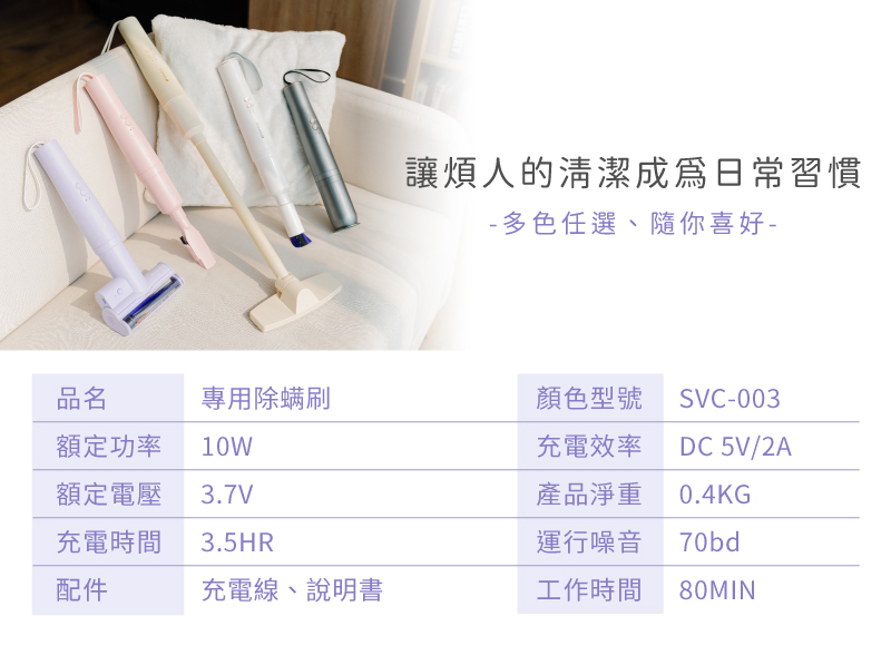 產品名稱:輕淨吸無線吸塵器 型號:SVC-DD1/SVC-L175/SVC-PP3/SVC-PP3Y 電池容量:2000mAh 充電電壓:使用5V/2A充電插頭 電壓/功率:額定電壓11.1V/100W 充電時間:3.5hr 工作時間:13~25min 真空吸力:≤16kpa 塵杯容量:0.15L 過濾方式:蜂巢式精鋼濾網/HEPA濾網 噪音值:≤82dB 主機淨重:600g 附件吸頭:地板刷、二合一扁刷 附件:延伸管、加長管、底座、TypeC充電線 產地:中國 保固:全機保固一年。 貨源:公司貨 |