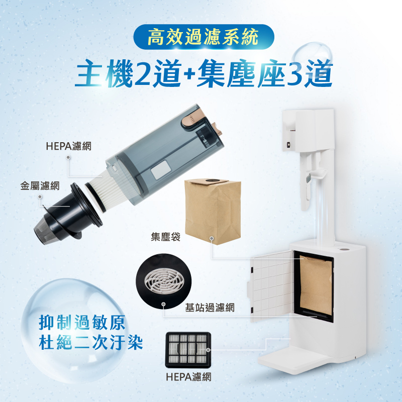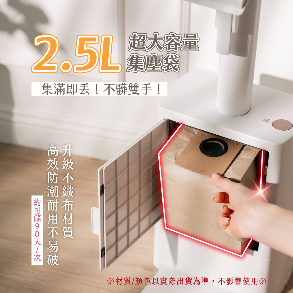● 2.5L超大容量集塵袋,垃圾自動打包