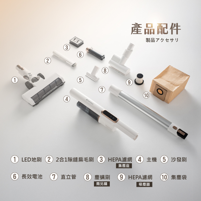 ● 附地刷/2合1扁刷/方形短毛刷,可加購塵螨刷