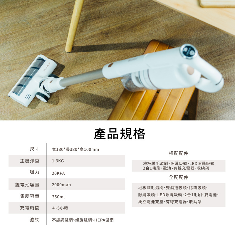 ● 標配組:地板絨毛滾刷x1、LED隙縫清潔吸頭x1、隙縫清潔吸頭x1、二合一毛刷吸頭x1、電池x1、有線充電器x1、收納架x1