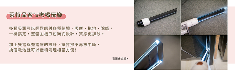 ● 濕拖套組:電動濕拖地刷x1、地板絨毛滾刷x1、LED隙縫清潔吸頭x1、隙縫清潔吸頭x1、二合一毛刷吸頭x1、電池x1、有線充電器x1、收納架x1