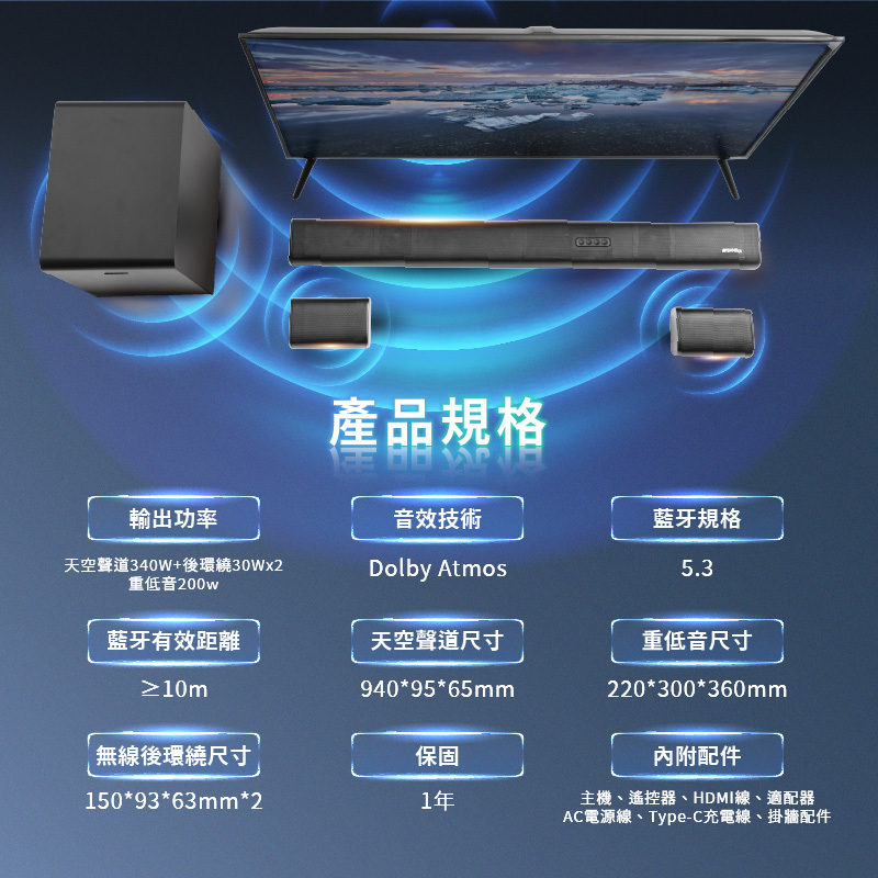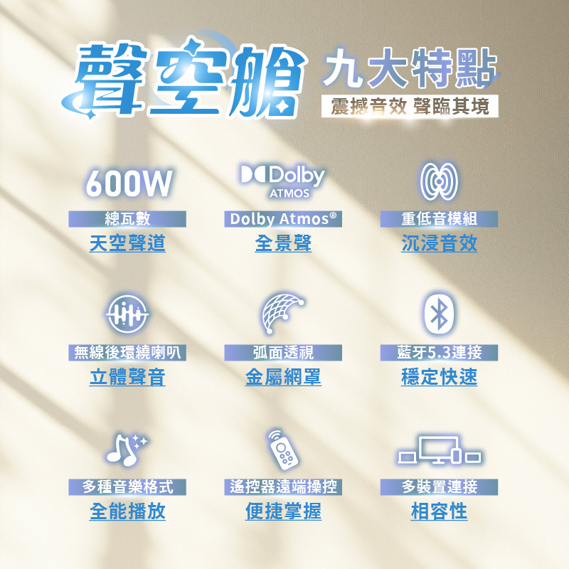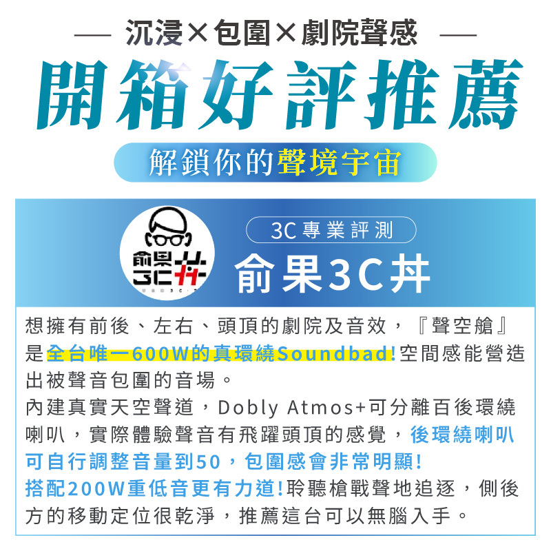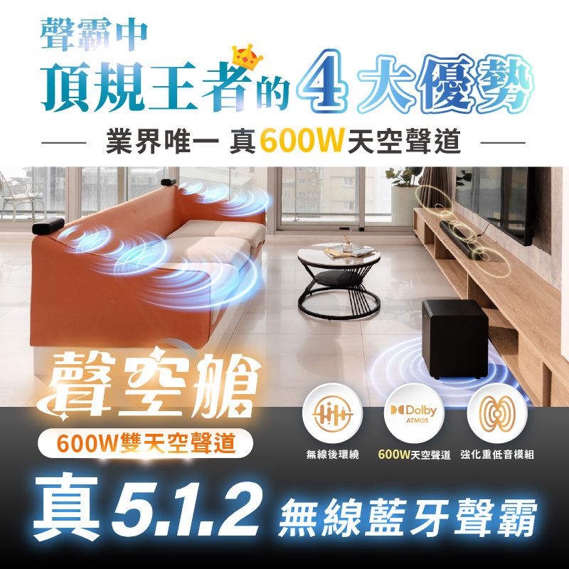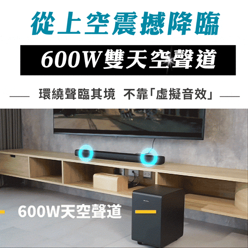 ● 600W雙天空聲道 震撼環繞升級!