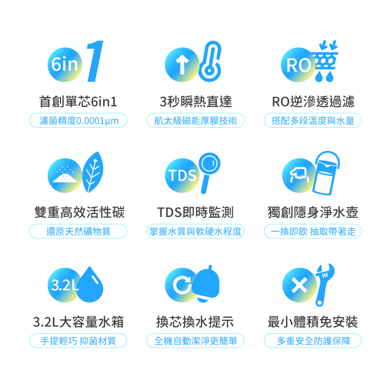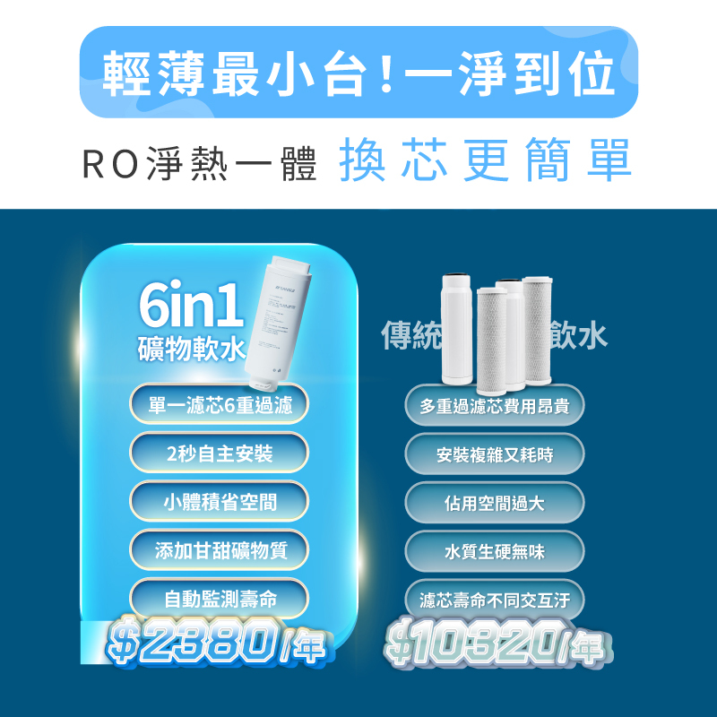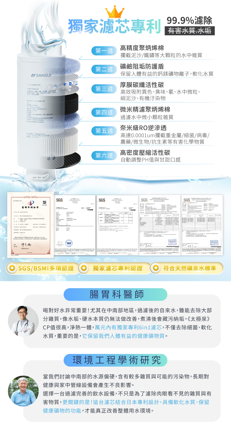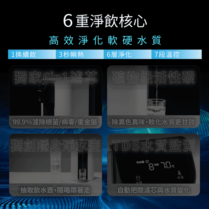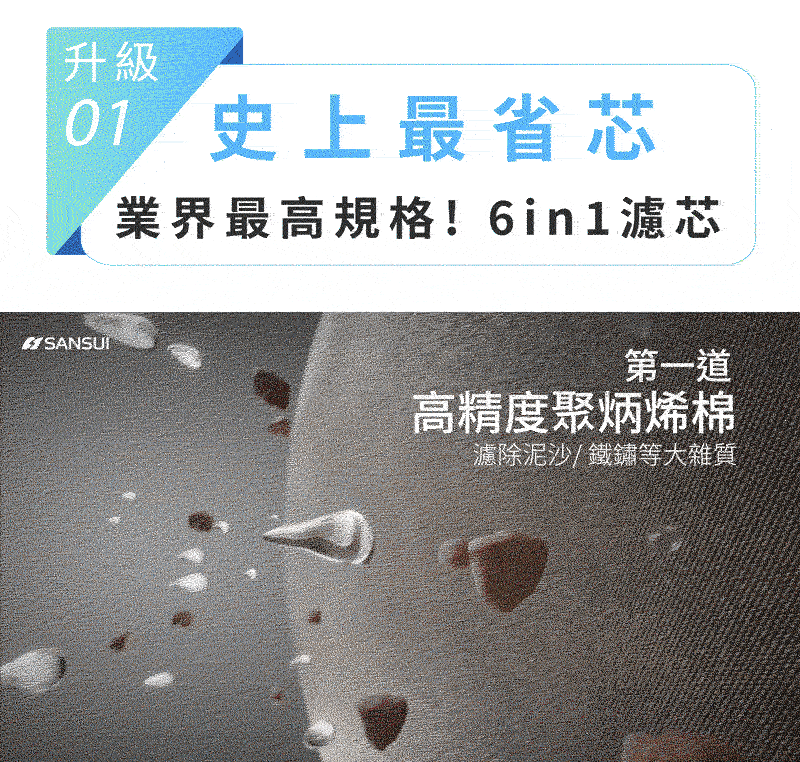 ● 單芯6in1|濾除總菌/病毒/重金屬,高效淨化軟硬水質