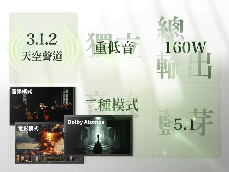●搭配多種聲音模式 (音樂/電影/Dolby Atmos 強化音效)